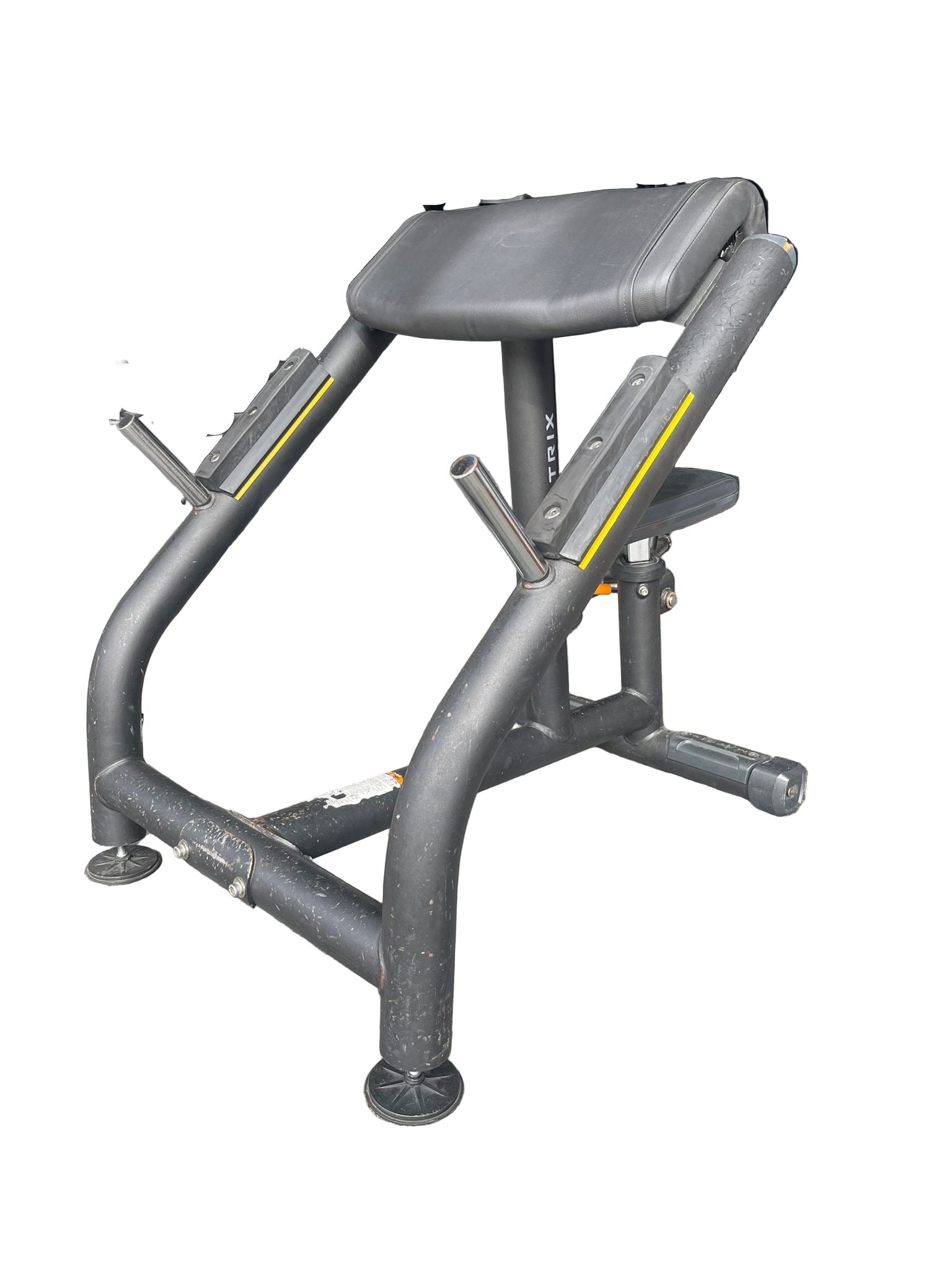 Elbow pad is angled at 55 degrees to vary resistance and improve user comfort Seat pad is angled at 10 degrees to improve stability and comfort Dual take-off pins positioned apart improve safety verses a center-bar catch