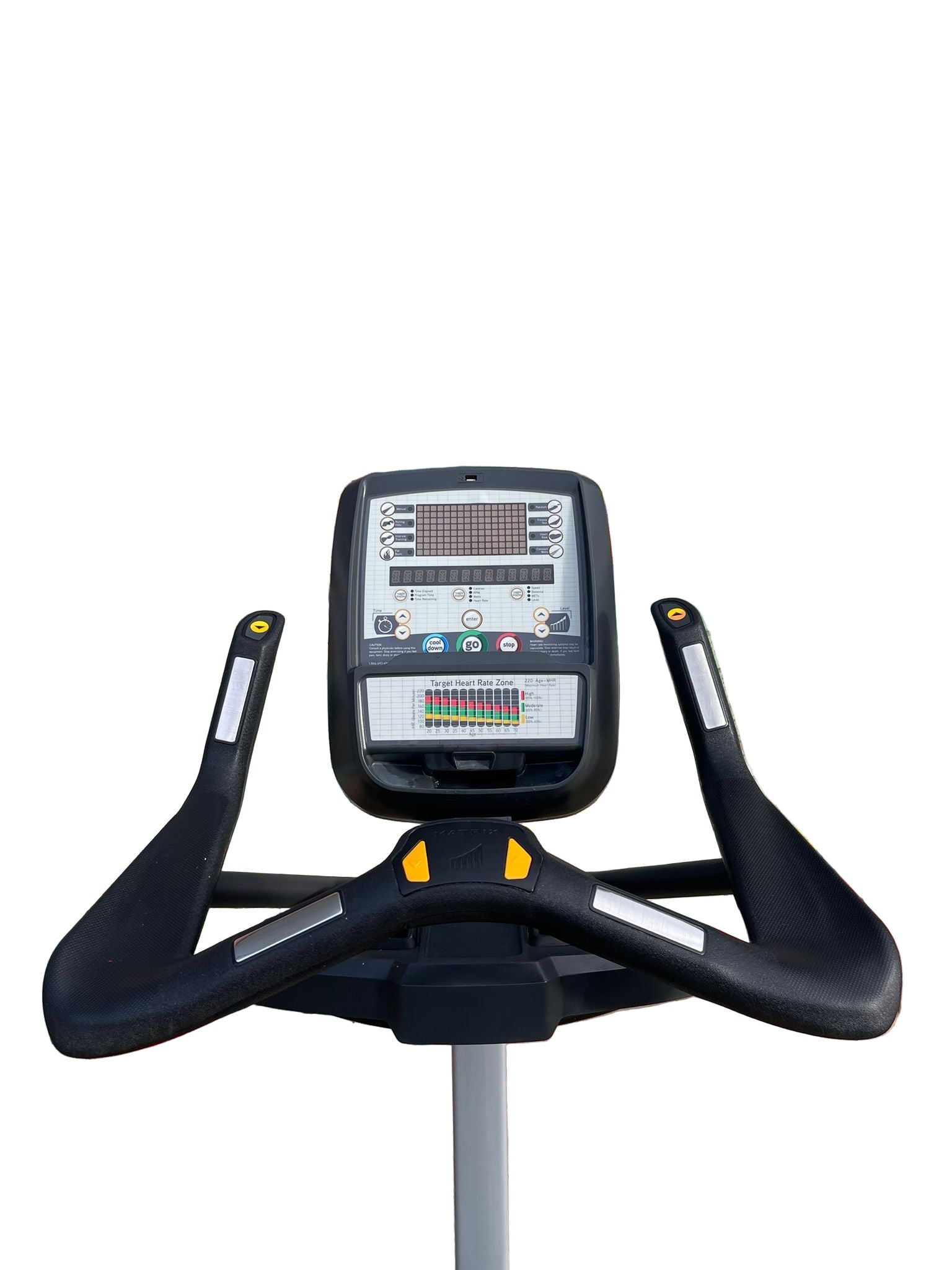Monitor your heart rate through the convenient hand grips and receivers to ensure you’re working within the correct target zone for optimum results. A vibrant LED console displays important information such as Time, distance, calories, calories per hour, level, speed, RPM, heart rate, METs, Watts and Profile so you can keep track of your progress.