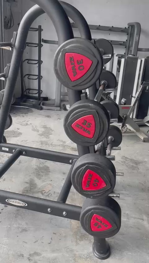 Ziva ZVO Polyurethane Fixed Weight Barbell Set 10-45kgs with Rack